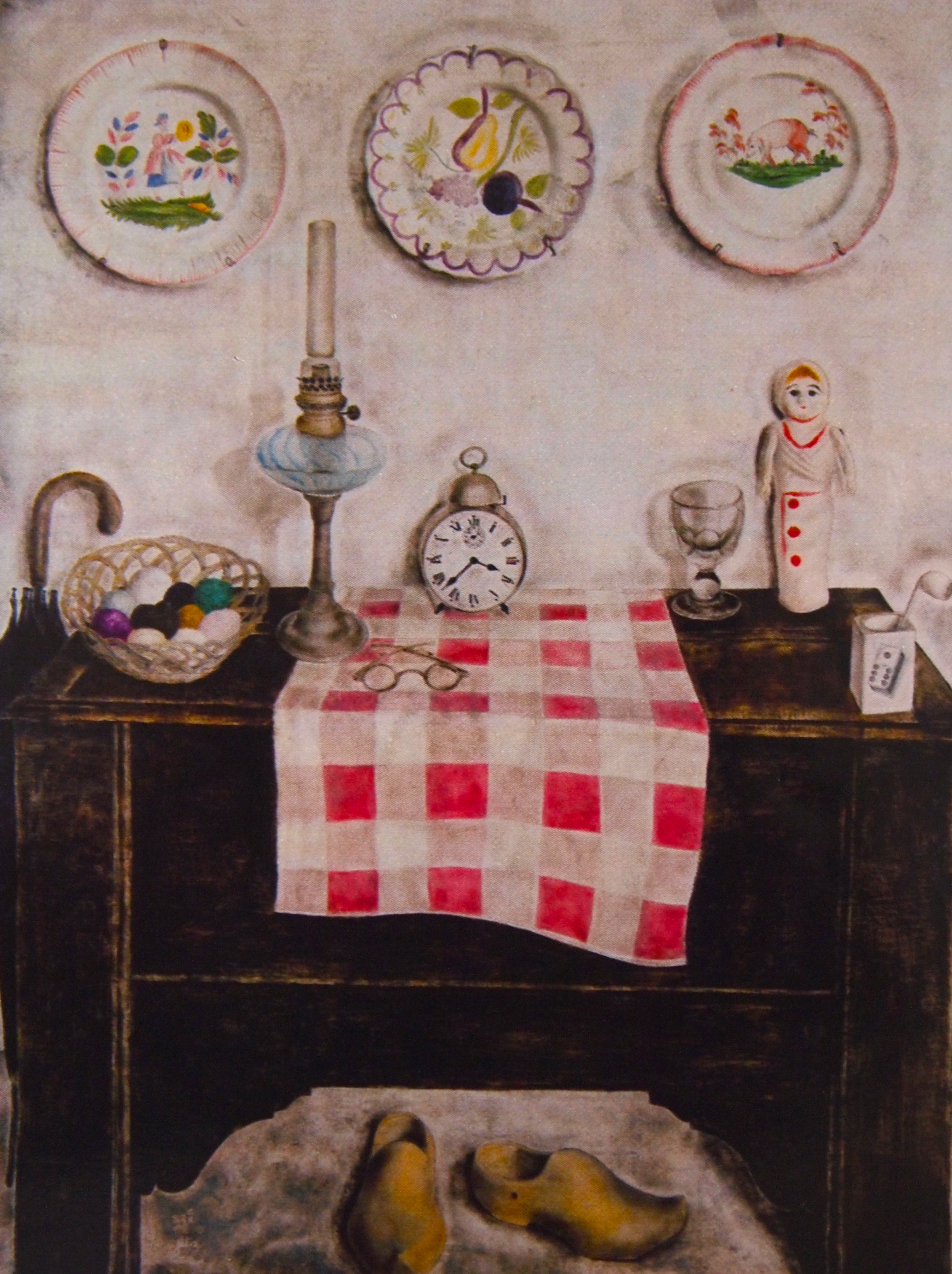「藤田の室内へのこだわりは傑出しており、ヨーロッパらしく窓や暖炉周り「壁」を基本に、フランス女性との結婚生活の中でパリらしい室内装飾を身に付けていった。1920年代初頭は自室の壁のしつらえをテーマとした「室内画」を好んで描いた。壁にかけた版画や飾皿など描写から「優れたデコレーターとしての才覚を証言できうるもの」蚤の市で入手したアンティーク十字架や燭台などキリスト教の礼拝道具など世界各地の幅広い収集品をセンスよく配置し、特におもしろいのは、菓子型やコーヒーミルやかご、など「生活道具」の転用」、とは楽しく興味深いもの。