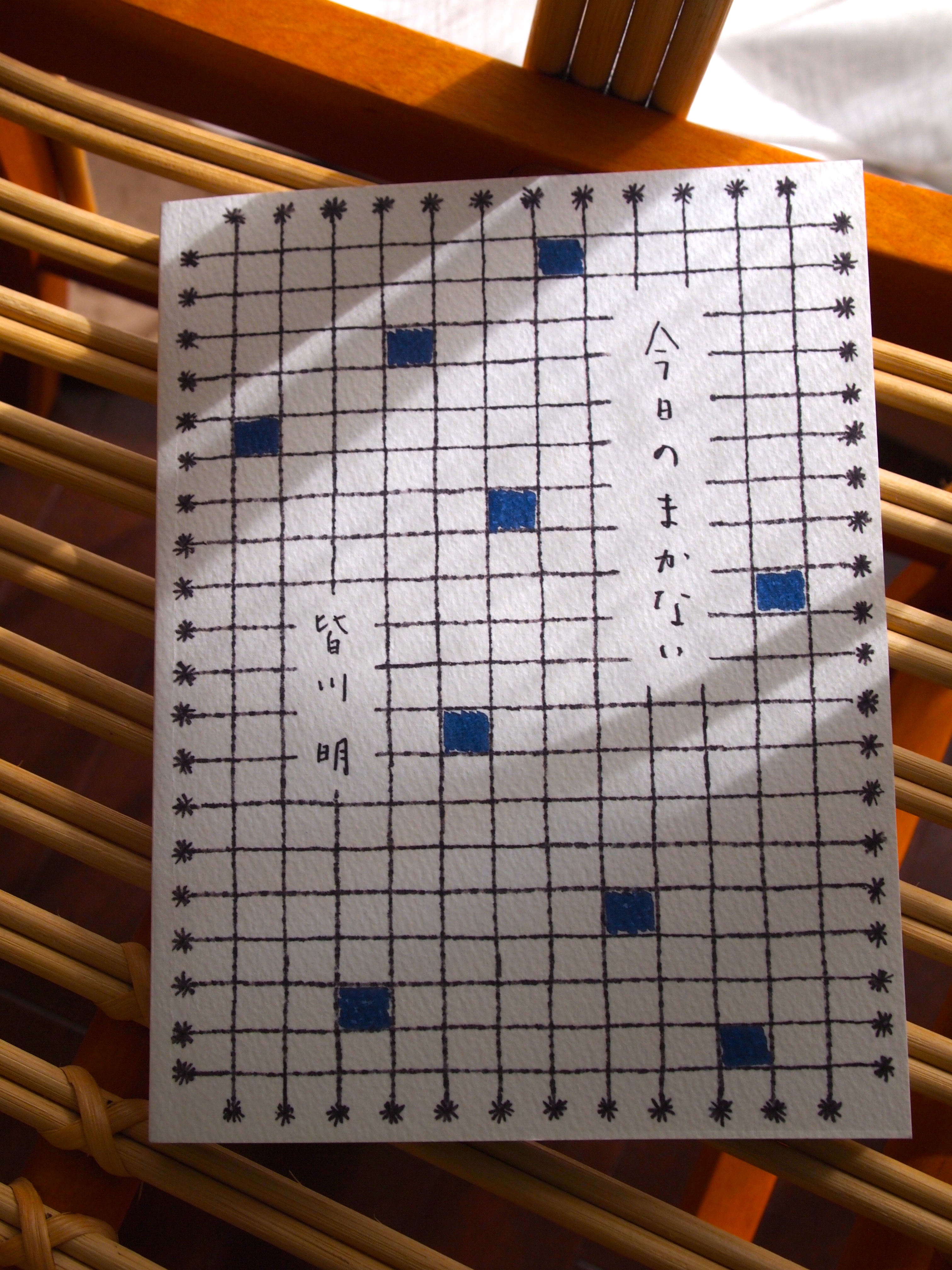 デザイナーの皆川明さんのお料理の本「今日のまかない」。皆川明さんはとても大切な友人。どのページも皆川さんらしく、多くのお料理がきちんとレシピつき、また北欧のリサ・ラーソンさんや建築家の中村好文さん始め多くのクリエイター方々との交流、器や道具まで、と読み応え見応えあるとても楽しいお料理の本。男性のお料理最近はあたりまえですが新鮮でいいものです。![]()