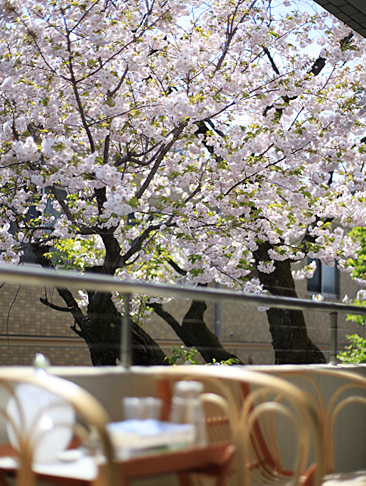 中庭で守ってくれているように立つ古い大きな山桜の木が見えるオフィスから